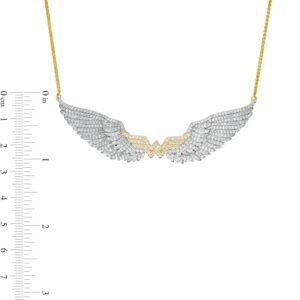 Soar to new heights in style with this show-stopping diamond wing necklace. Crafted in warm 10K gold, this dazzling design features layered feathers decked with shimmering diamonds. At the center, the logo sparkles with diamond-studded detail. Spectacular with 2 cts. t.w. of diamonds and a brilliant buffed luster, this 2.9-inch look suspends centered along a 15.1-inch wheat chain that secures with a lobster claw clasp. This exclusive fine jewelry collection inspires you to wear your strength, confidence and power.